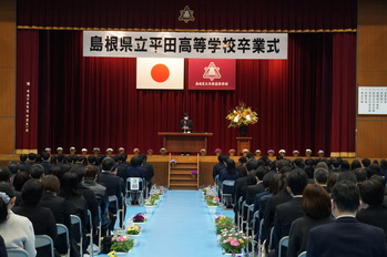 3月1日(火)、3年生148名が卒業の日を迎えました。この2年間は新型コロナウィルス感染症の影響で様々な制約を受けましたが、仲間達と支え合い、工夫しながら学校生活を送った3年生でした。 これからは平田高校での経験を糧として、それぞれの道を力強く歩んでいってください。卒業生の皆さんの今後の活躍を心からお祈りしています。